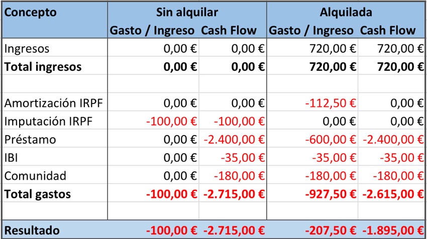 Como se puede ver, si no está alquilada, se producen unos pagos anuales de 2.715€ y un ingreso fiscal, por el que hay que pagar, de 100€.